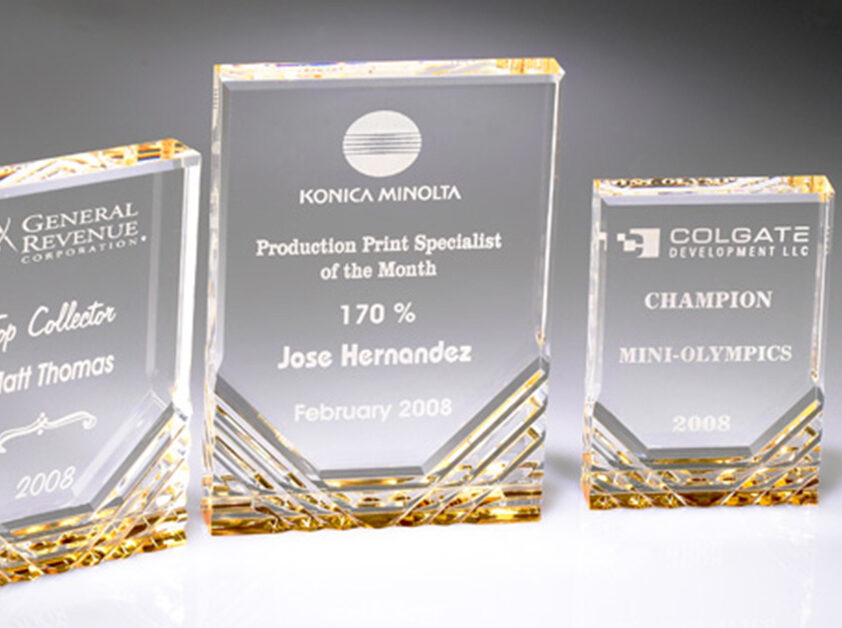 • Acrylic Trophies & Crystal Plaques with printed company logo and name